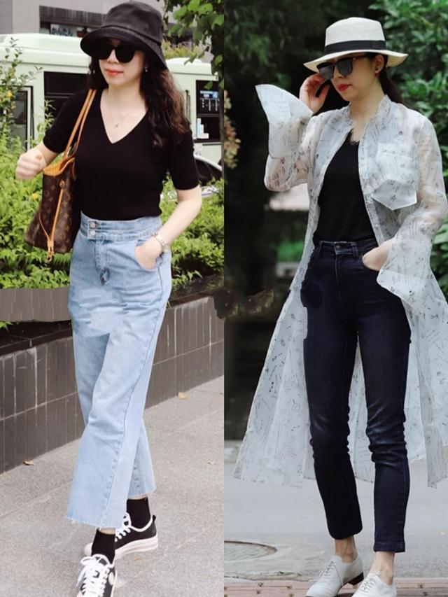 我们都知道黑色对微胖女性很友好,因为黑色的收缩性所呈现出来的视觉显瘦效果十分出色,从而减轻中年女性身材不协调的烦恼,带来更加美好的穿衣体验。上衣为黑色针织衫,v领剪裁给脖颈提供了一定的露肤空间,打造出纤细感,清爽不沉闷。下面搭配了牛仔直筒裤,可以看出直筒裤对腿型的修饰能力很不错,而且百搭效果不容忽视。配上一双带有学院风的帆布鞋,尽显青春减龄风采,感受青春无限美好。