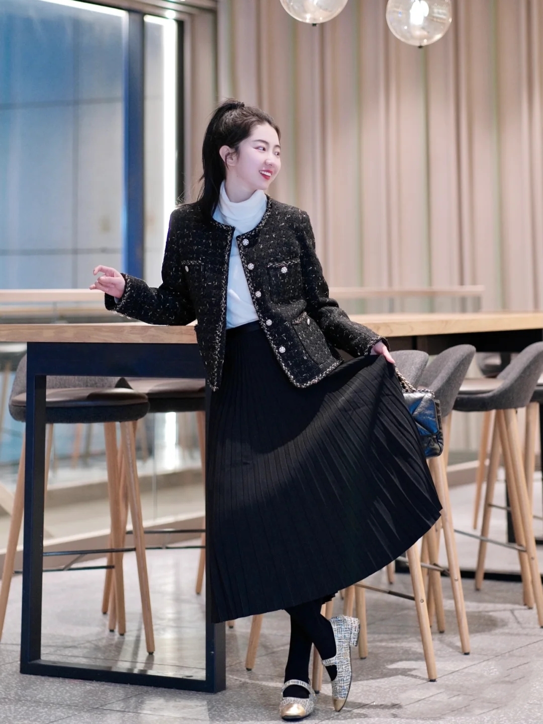 小香风半身裙搭配图片:小香风外套配百褶长裙和小高跟,完美诠释30岁女人的轻熟风!