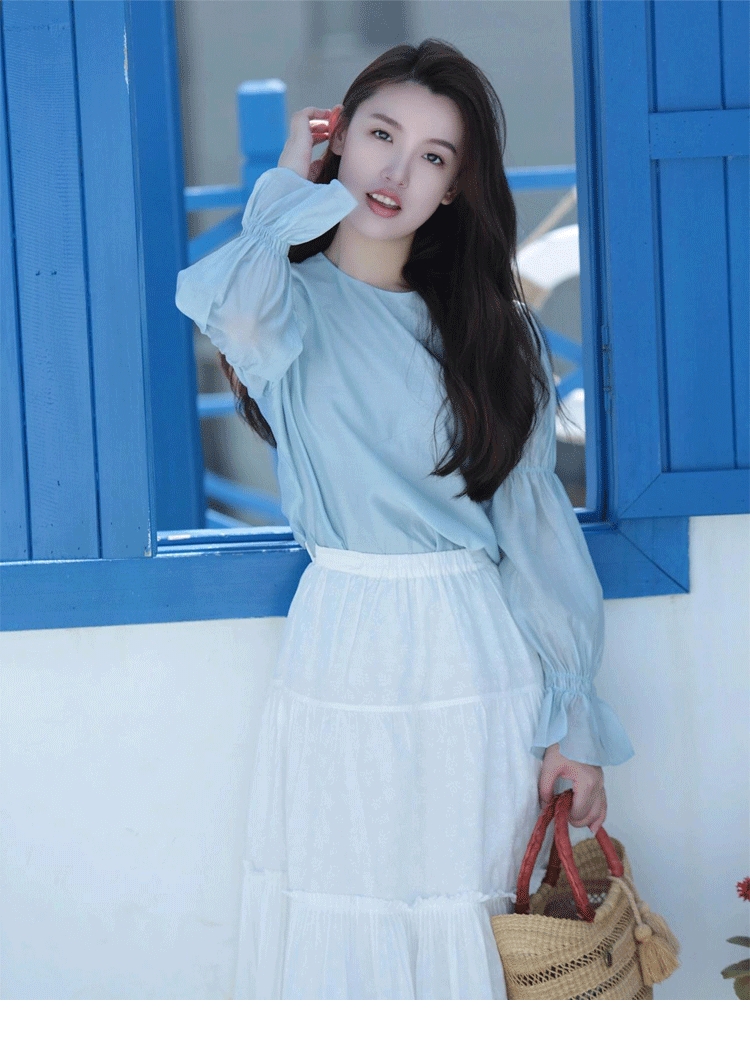 快来跟着小姐姐学穿搭,浅蓝色宫廷风泡泡袖法式上衣搭配纯白色三截拼接长裙,优雅恬静又青春靓丽。